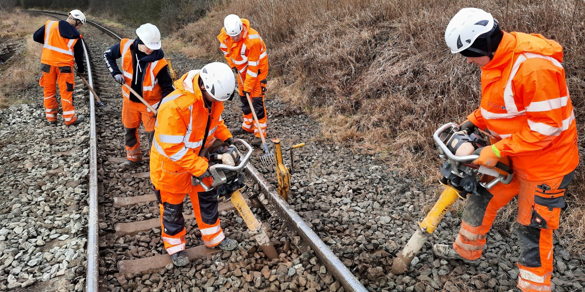 Der erste Schritt ist dabei immer die Überprüfung des Messgeräts selbst, damit man sich sicher sein kann, dass die Messungen am Ende auch stimmen. Auch das Anlegen des Präzisionsmessgeräts rechtwinklig zur Schiene will gelernt sein, denn schon kleinste Abweichungen können zu großen Messungenauigkeiten führen. Aber Messen ist nur die halbe Miete. Unsere Azubis haben natürlich ebenso geübt, wie man die gemessenen Abweichungen dokumentiert und bewertet, ob sie innerhalb der Toleranzen liegen. Erste Abweichungen haben unsere angehenden Profis dann auch gleich mit sogenannten Vibrationsstopfern nachgearbeitet.