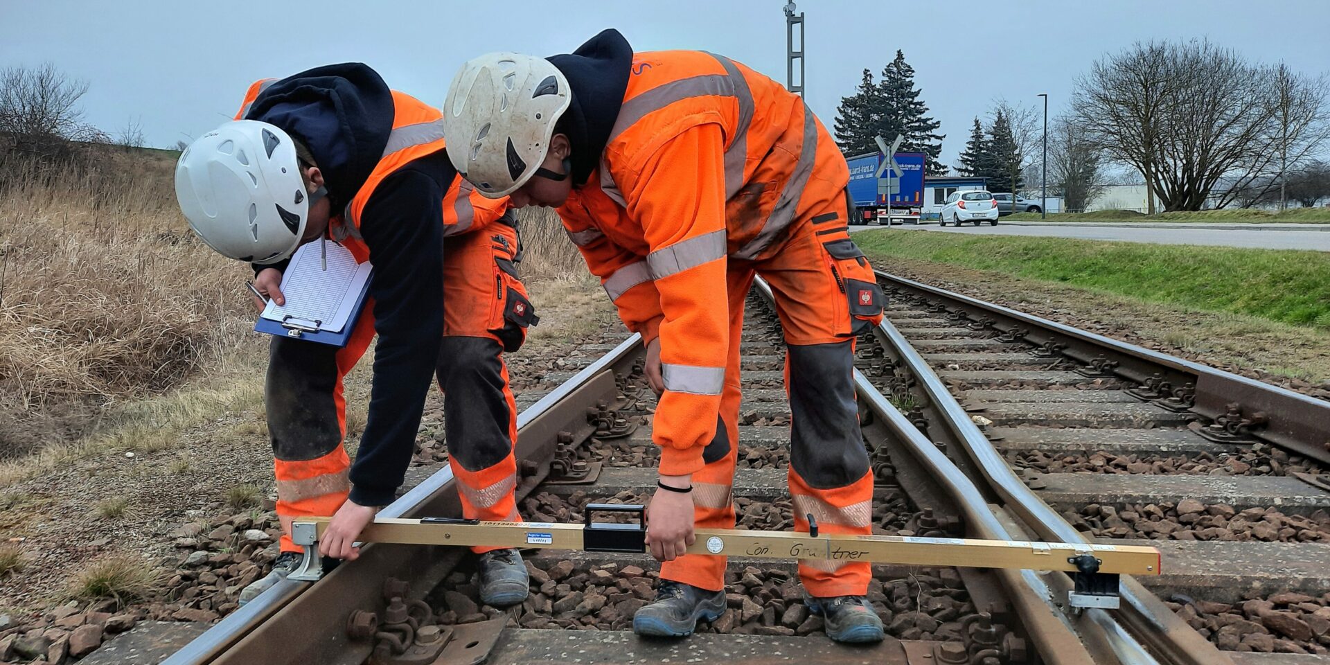 Der richtige Umgang mit Messinstrumenten erfordert viel Übung. Am besten geht das unter Realbedingungen – wie hier bei einem Azubi-Projekt auf dem Gelände unserer Tochter SPITZKE FAHRWEGSYSTEME GmbH (SFS) in Mecklenburg-Vorpommern.