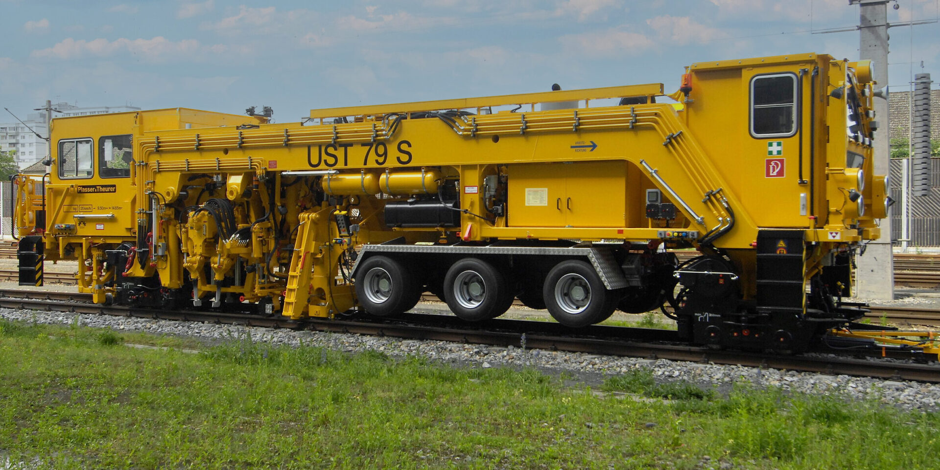 The UST 79 S universal tamping machine is a road-rail machine. It is equipped with a three-axle road chassis and semi-trailer for transport on the road. This enables transfer independent of railway schedules, even to railway networks that are difficult to access. The machine is equipped with heavy-duty tamping units, lifting and aligning units, measurement systems, an optional front compactor, a level-directional laser and an 8-channel measurement recorder. The machine can be used on tracks and in points.